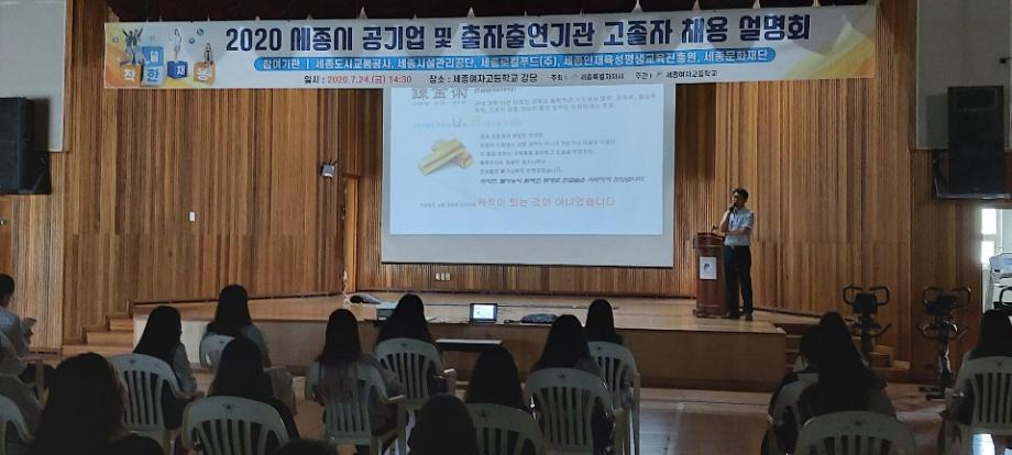 세종특별자치시(시장 이춘희)가 지난 24일 세종여자고등학교 강당에서 진행한 ‘세종시 지방공기업 및 출자출연기관 고졸자 채용설명회’가 특성화고 졸업예정자 50여 명이 참여한 가운데 성황리에 마무리됐다.