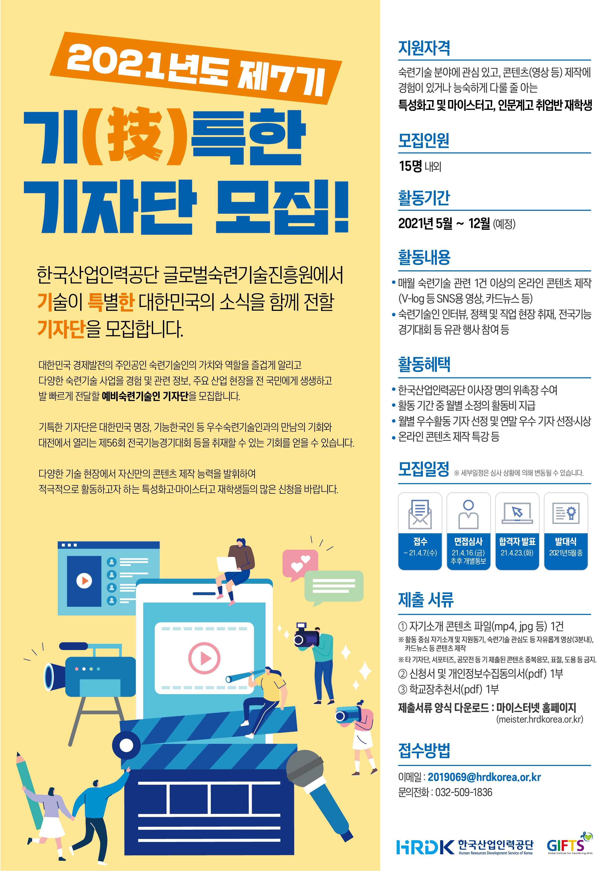 이에 기술로 성공한 숙련기술인 인터뷰 및 다양한 직업·진로에 대한 콘텐츠를 제작하여 온라인 등을 통해 확산하는 역할을 수행할 2021년도「기(技)특한기자단」을 아래와 같이 모집함을 알려드리니, 숙련기술에 관심있는 학생들들의 많은 참여 바랍니다.