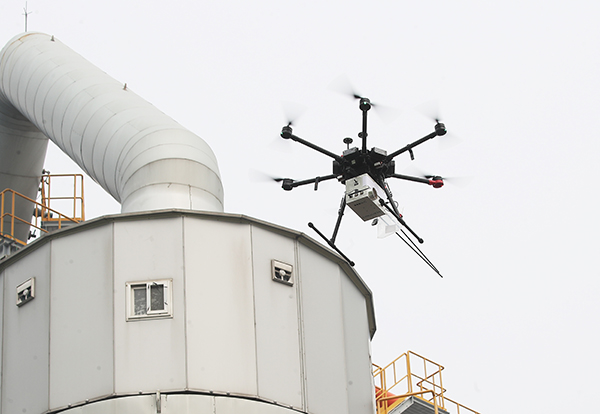 경기도 시흥시 정왕동 아세아제지 시화공장에서 수도권대기환경청 관계자들이 드론을 이용한 미세먼지 측정을 하고 있다. (사진=저작권자(c) 연합뉴스, 무단 전재-재배포 금지)