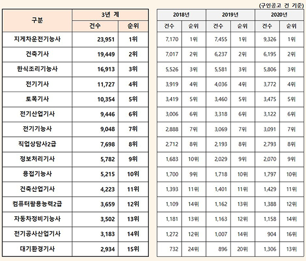 구인 공고에서 가장 많이 요구하는 자격증은 지게차운전기능사로 나타났다. 건축기사와 한식조리기능사도 2위와 3위로 인기가 여전했다. 특히 최근엔 탄소중립 정책 추진의 영향으로 대기환경기사 등 일부 자격증의 인기도 급상승했다.