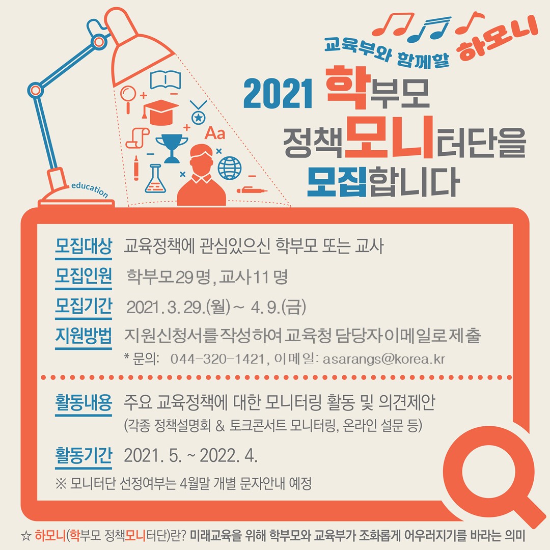 교육부에서는 교육정책 수립·시행 과정에 학부모의 다양한 의견을 직접듣는 소통의 창구를 마련하고자 다음과 같이 2021년 『학부모정책 모니터단』을공개 모집하오니 교육정책에 관심 있는 분들의 많은 참여를 바랍니다.